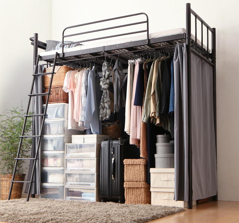 ロフトベッド最大のメリットは、何と言ってもその圧倒的な収納力です。ベッド下の空間は、シングルサイズでも約2畳分。ここに手持ちのチェストや収納ボックス、ハンガーラックなどを自由に配置すれば、まるで小さなウォークインクローゼットが出現します。